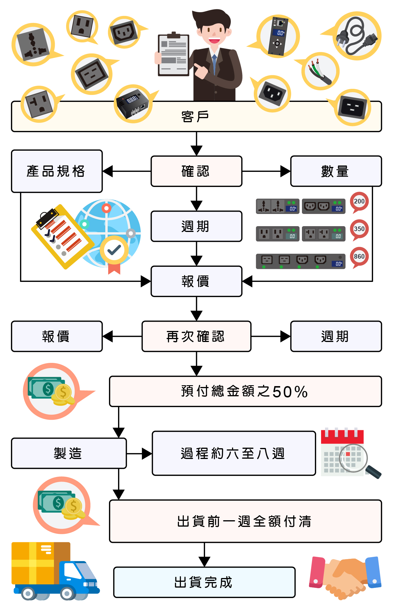 5. 製造過程約六至八週(材料、PCB面板、置入產品零件、組裝與測試)。